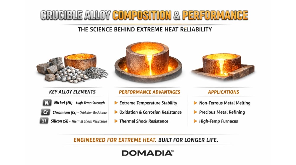 #CrucibleAlloyComposition #HighTemperatureAlloys #Metallurgy #IndustrialFurnaces #DOMADIA #ExtremeHeatMaterials