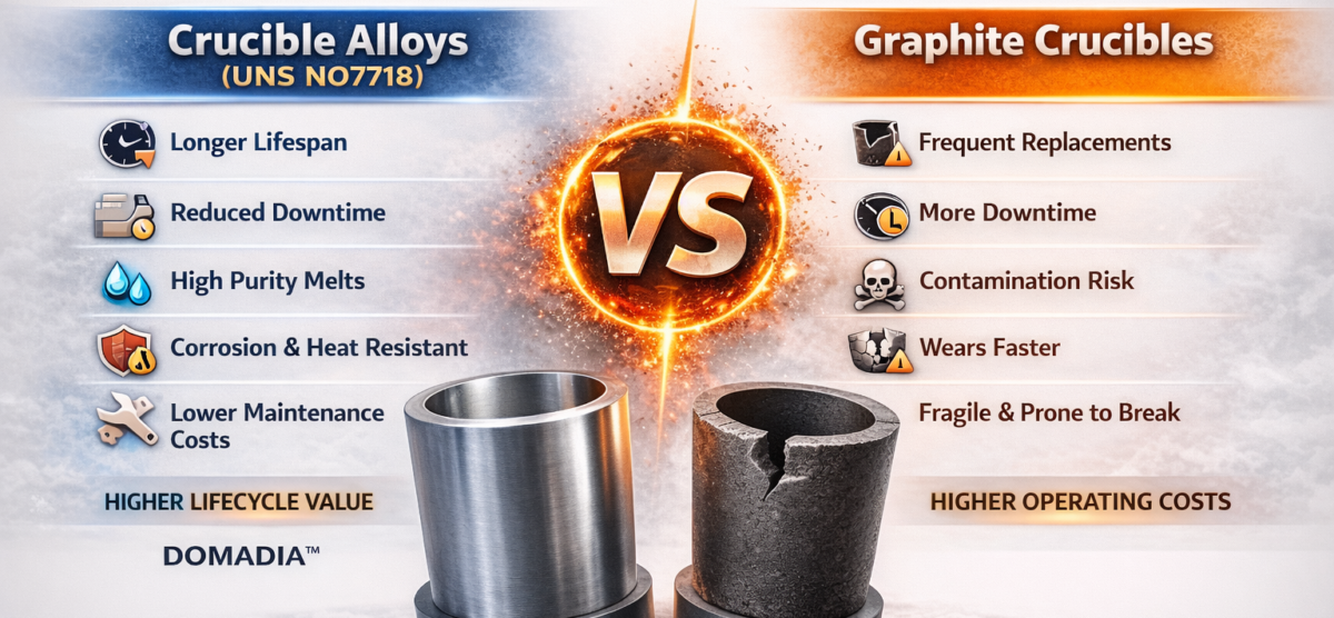 Connect with DOMADIA™ to choose the right crucible material—UNS N07718 alloy or graphite—based on lifecycle cost, uptime, and thermal reliability.