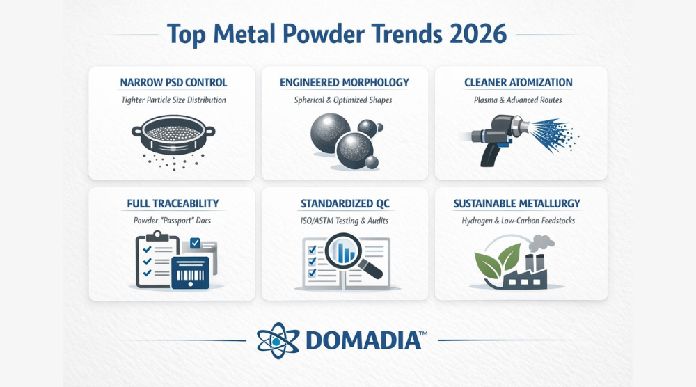 If your next project involves AM, PM, thermal spray, or functional powder builds, DOMADIA™ can help you shortlist powder grades, morphology, PSD windows, and standards-aligned documentation—so your production doesn’t learn the hard way.Metal Powder Trends 2026 aren’t coming. They’re already here.